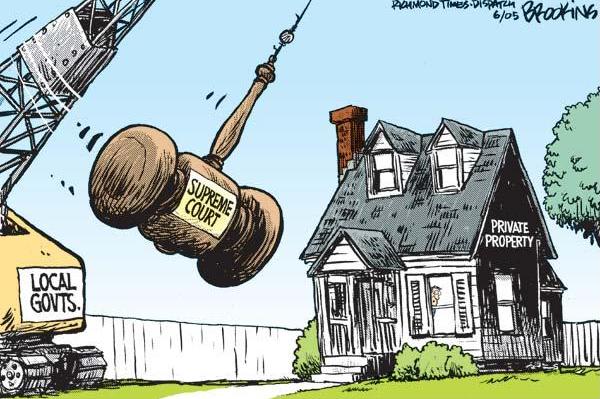 Kelo v. City of New London, 545 U.S. 469 (2005) was decided by the Supreme Court of the United States involving the use of eminent domain to transfer land from one private owner to another to further economic development. The case arose from the condemnation by New London, Connecticut, of privately owned real property so that it could be used as part of a comprehensive redevelopment plan. The Court held in a 5–4 decision that the “general benefits a community enjoyed from economic growth” qualified such redevelopment plans as a permissible “public use” under the Takings Clause of the Fifth Amendment. In the landmark case, the Supreme Court said the City of New London was within its rights to condemn and seize the property of nine citizens and provide that land to Pfizer, a multi-billion dollar drug corporation, for a $300 million research facility that was included in the city’s new development plan. The ruling set loose a wave of government seizures, including 700 acres in California owned by 246 different people, to be used for an automobile test track. This fanned widespread fear that retailers such as Wal-Mart or Target – for research of course – would convince local governments to expand the scope of public use to include commercial entities such as shopping malls or independent retail stores, making it easier for these businesses to expand into markets where there is little open space to build new stores. In response to the ruling, California developer Logan Darrow Clements of Natural-rights.org presented plans to the Weare, NH, city council for the construction of the Lost Liberty Hotel on the property owned by Supreme Court Justice David Souter, one of the assenting voters. The $100,000 property was only earning $2895 in taxes per year, and Clements assured the court his hotel would be paying the county much more than that, plus it would provide the local work force new employment opportunities. Over 1400 potential registrants signed up in two months to support the inn. After months of negotiation, a “warrant article” was prepared and voted on at a town meeting on February 4, 2006. Voters reworded the article to call upon state legislators to oppose taking private property for use by private developers. Although the ballot initiative supporting the Lost Liberty Hotel project went down in defeat on March 14, 2006, Clements got nationwide attention and support from states as far away as Washington and Texas, and the US House of Representatives voted 376-38 in November, 2005, to approve the Private Property Rights Protection Act of 2005 which would prohibit states and local communities receiving federal funds from invoking eminent domain as a means for private industry to build private businesses. The bill would have allowed private property owners the right to sue the government if they were stripped of their land through the use of eminent domain and later found that the land was given to a private developer. David Snyder, an eminent domain attorney and partner at Fox Rothschild LLP said the legislation could hamper big business, and it was not passed by the Senate. On April 2, 2009 similar legislation was introduced by Rep Maxine Waters (D-CA) with 26 cosponsors. HR 1885, the Private Property Rights Protection Act of 2009 prohibits a state, political subdivision, or the federal government from exercising its power of eminent domain for the purpose of economic development. On May 26 it was referred to the Subcommittee on the Constitution, Civil Rights, and Civil Liberties. |