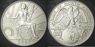 It is becoming apparent that concerns of many Americans are coming true: That closed-door meetings between U.S., Canadian and Mexican heads of state are resulting in the merger of the three nations into a North American Union (NAU). Proof that the merger is going forward would be the release of a common currency similar to the "euro" which is exchanged among 15 European Union "states." Talk of the "amero" has been floating around for about a year, but, until recently, there had been no hard evidence. Above is a photo of a real amero. Someone in the U.S. Treasury sent professional images to talk show host Hal Turner with a note saying they liked his radio show and are frightened by what's been going on in secret within our government. Shortly thereafter, Turner received an actual amero (pictured above) in the mail. The economic conditions most likely to bring the amero into circulation, which at this time appears to be inevitable, would be the crash of the dollar, aided by foreign investors dumping their dollars and Treasury bonds and the resultant economic collapse, which could happen at any moment. We can also expect that the NAU will come in under chaotic conditions since the entire scheme has been developed in secrecy.