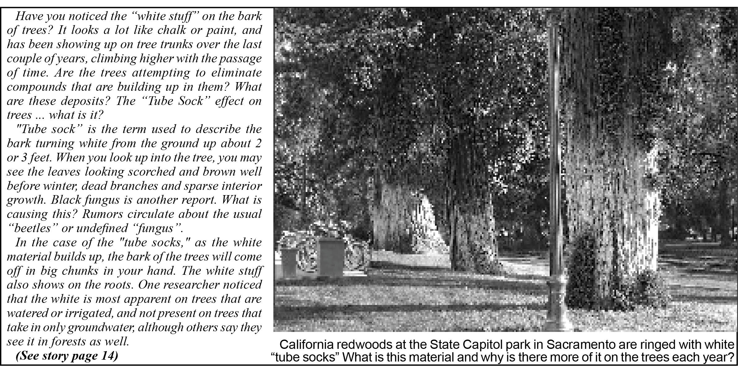 Deborah Whitman of Davis, California founded Environmental Voices, and is offering to help people test the health of their local trees. So far, local bark samples from Northern California show high residues of aluminum, barium and titanium, which might be the source of the white deposits we are seeing.